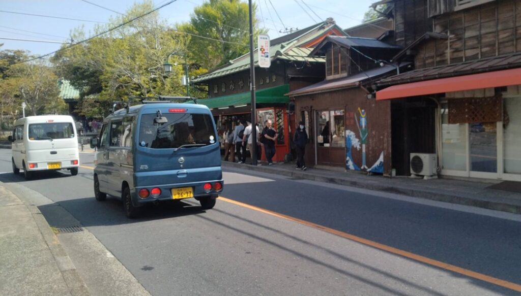目の前は「鎌倉藤沢線」というバス通りだが、意外と交通量が多い。それよりも、観光客が多い。なので、車が走っていなくても、観光客がぞろぞろ歩いていてなかなか出られないことがある。このあたりは鎌倉住民の「あきらめの境地」と言えよう。
